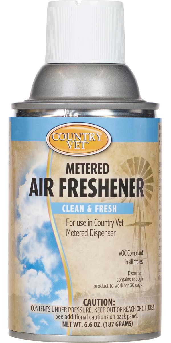 Country Vet Metered Air Fresheners eliminate offensive odors while leaving behind a high quality fragrance that lasts longer than ordinary air fresheners. Odor counteractants contained in Country Vet Air Fresheners actually eliminate offensive odors. Our premium fragrances linger in the air longer to create a more pleasant atmosphere. Use in homes, offices, veterinary clinics, kennels or wherever you wish to create a more pleasant environment.