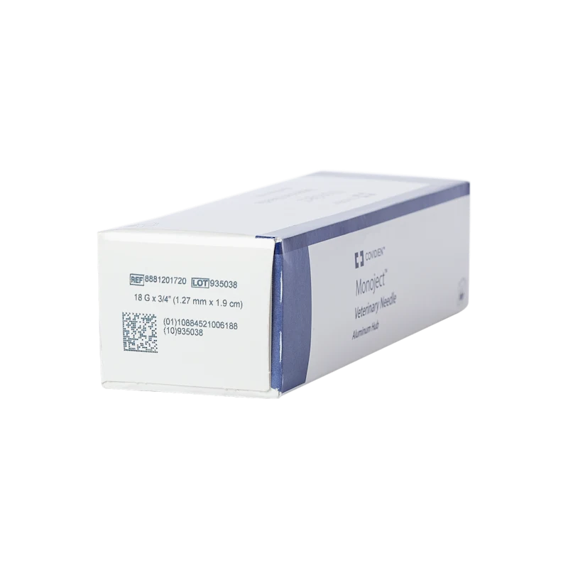 Monoject™ veterinary needles with aluminum hub are specifically designed for use in animals, featuring a stiffer, stronger aluminum hub than standard needles with aluminum hub. They are sterile, single use, latex-free and come individually packaged in rigid pack. Special bevel grind specifically designed for use in animals. Color coded needle sheath allows for easy indentification of needle gauge. Aluminum luer lock hub provides very secure fit; needle can be manipulated with less chance of breakage compared to epoxy design. Heat stake; cap-to-sheath seal provides visible and audible tamper evidence; guarantees sterility before use; assures end user confidence. Rigid polypropylene hard pack protects against accidental product contamination and provides particulate-free package.